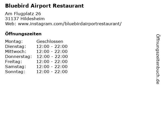 | Öffnungszeiten Bluebird Airport Restaurant in Hildesheim anzeigen | |
