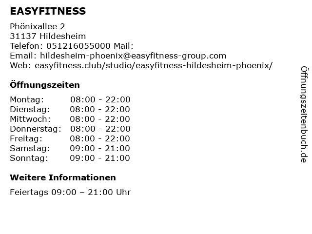 | Telefonnummer EASYFITNESS in Hildesheim (051216055000 Mail:) anrufen | |