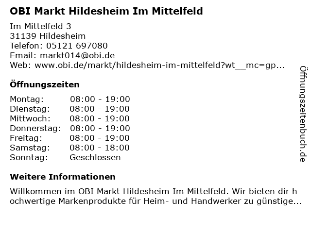 2 OBI Holzzuschnitt-Service im Markt Hildesheim (Entfernung: 4,48 km) Senkingstraße 1, 31137 Hildesheim 6 OBI Mietgeräte und Werkzeugverleih Hildesheim (Entfernung: 4,48 km) Senkingstraße 1, 31137 Hildesheim |