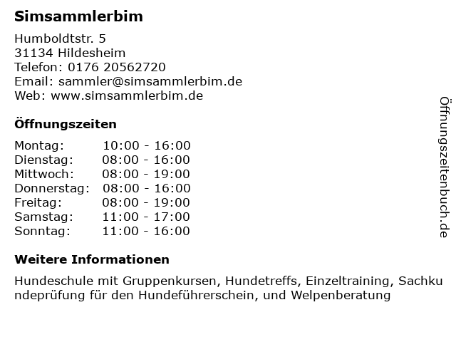 | Öffnungszeiten Simsammlerbim in Hildesheim anzeigen | |