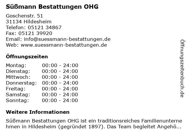 | Öffnungszeiten Süßmann Bestattungen OHG in Hildesheim anzeigen | |