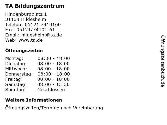 | Öffnungszeiten TA Bildungszentrum in Hildesheim anzeigen | |