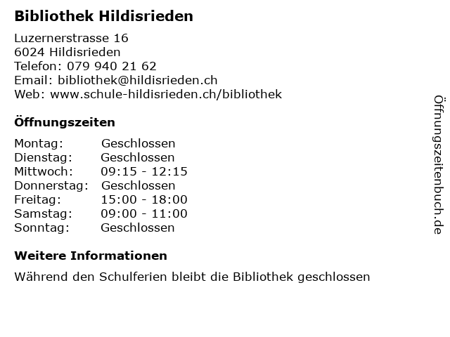| Öffnungszeiten Bibliothek Hildisrieden in Hildisrieden anzeigen | |