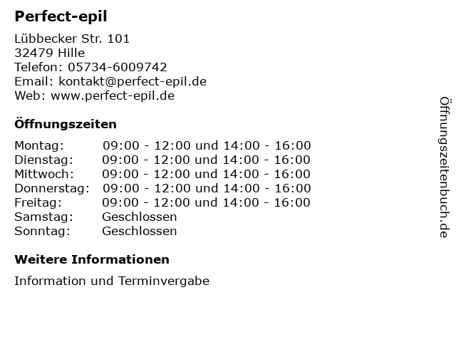 | Öffnungszeiten Perfect-epil in Hille anzeigen | |