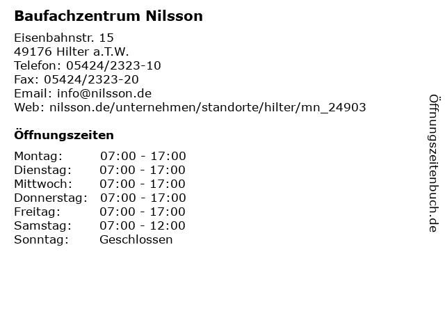 | Öffnungszeiten Baufachzentrum Nilsson in Hilter a.T.W. anzeigen | |