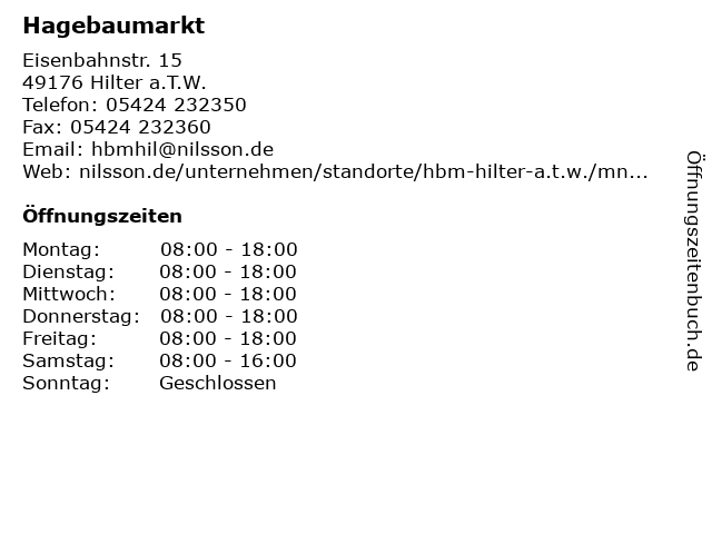 | Öffnungszeiten Hagebaumarkt in Hilter a.T.W. anzeigen | |