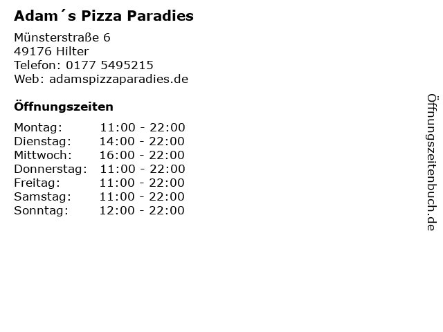 | Öffnungszeiten Adam´s Pizza Paradies in Hilter anzeigen | |