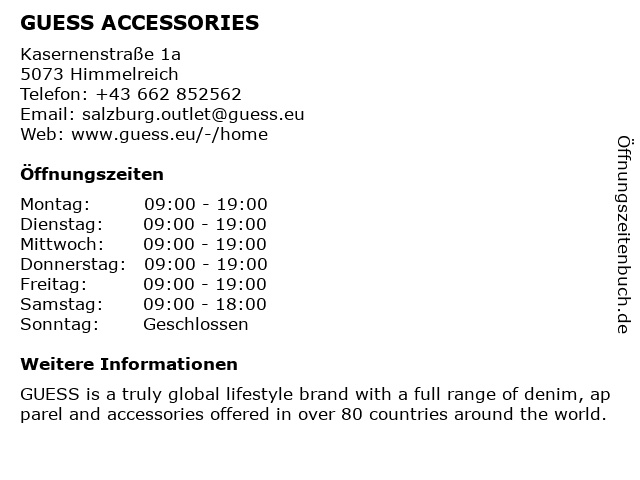 | Telefonnummer GUESS ACCESSORIES in Himmelreich (+43 662 852562) anrufen | |