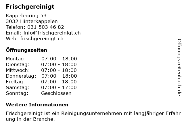 | Öffnungszeiten Frischgereinigt in Hinterkappelen anzeigen | |