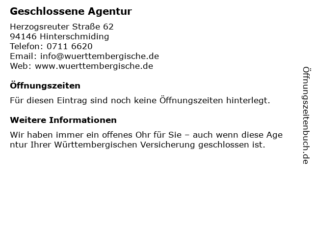 | Öffnungszeiten Geschlossene Agentur in Hinterschmiding anzeigen | |