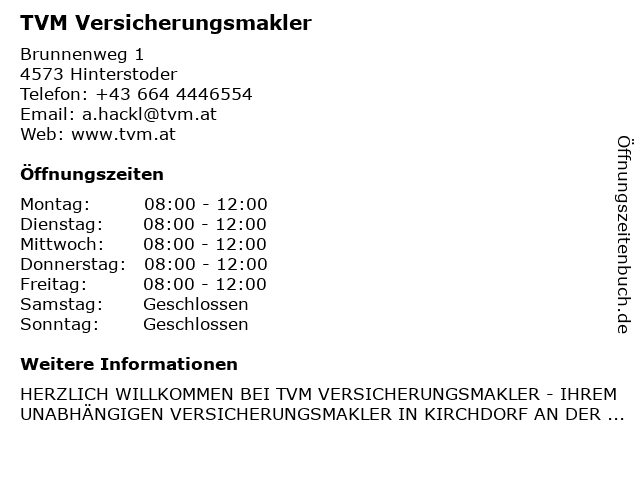 1 Keferböck & Partner Gesellschaft m.b.H. - Unabhängige Versicherungsmakler (Entfernung: 16,30 km) Fronleichnamsweg 8, 8940 Liezen 2 UNIQA GeneralAgentur Regional GmbH & Kfz Zulassungsstelle (Entfernung: 13,00 km) Schulstraße 14, 4580 Windischgarsten 3 UNIQA Versicherungen AG - GeneralAgentur Fladl Peter (KFZ Zulassung) (Entfernung: 15,07 km) Hauptstraße 355a, 8940 Weißenbach b. Liezen 4 UNIQA GeneralAgentur Bernhard Schachner GmbH & Kfz Zulassungsstelle (Entfernung: 15,08 km) Hauptstraße 355b, 8940 Weißenbach bei Liezen 6 |