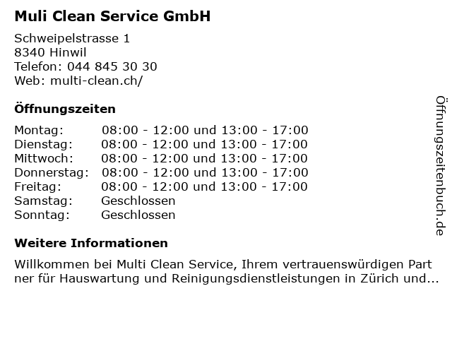 | Öffnungszeiten Muli Clean Service GmbH in Hinwil anzeigen | |