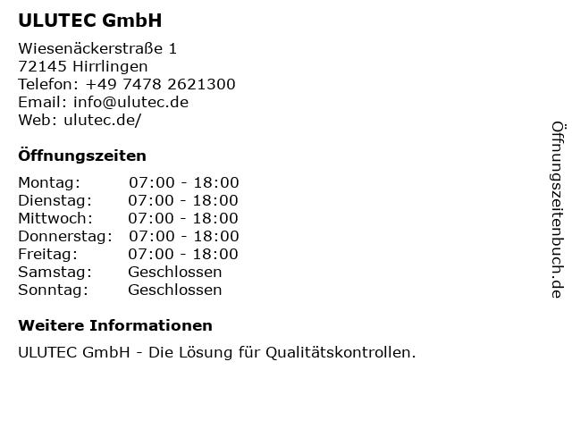 | Öffnungszeiten ULUTEC GmbH in Hirrlingen anzeigen | |
