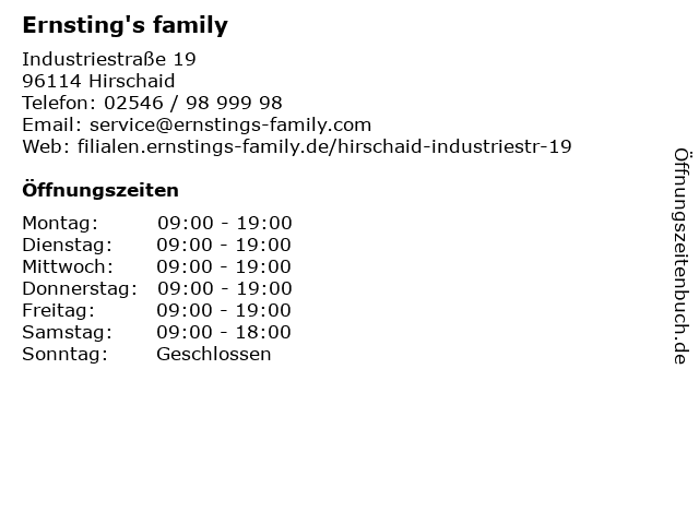 | Öffnungszeiten Ernsting's family in Hirschaid anzeigen | |