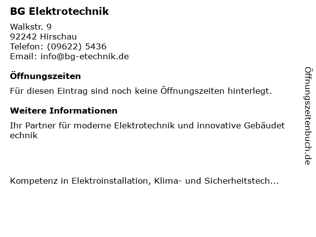 | Öffnungszeiten BG Elektrotechnik in Hirschau anzeigen | |