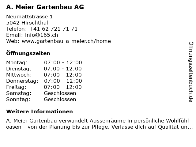 Öffnungszeiten A. Meier Gartenbau AG in Hirschthal anzeigen | |