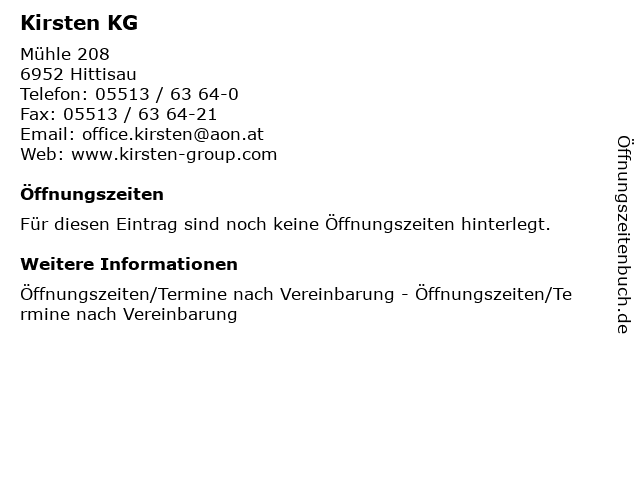 | Öffnungszeiten Kirsten KG in Hittisau anzeigen | |