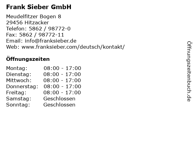 | Öffnungszeiten Frank Sieber GmbH in Hitzacker anzeigen | |