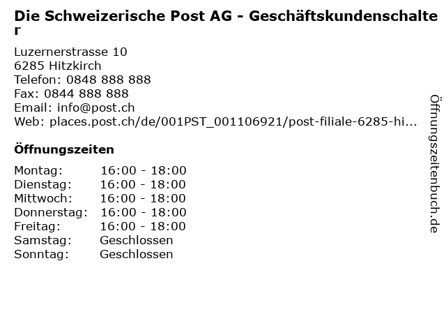 Branchen & Suchbegriffe zu Die Schweizerische Post AG - Geschäftskundenschalter:geschäftskunden, geschäftskundenschalter, hitzkirch, pakete, post, päckchen, schalter, schweizerische, versand |