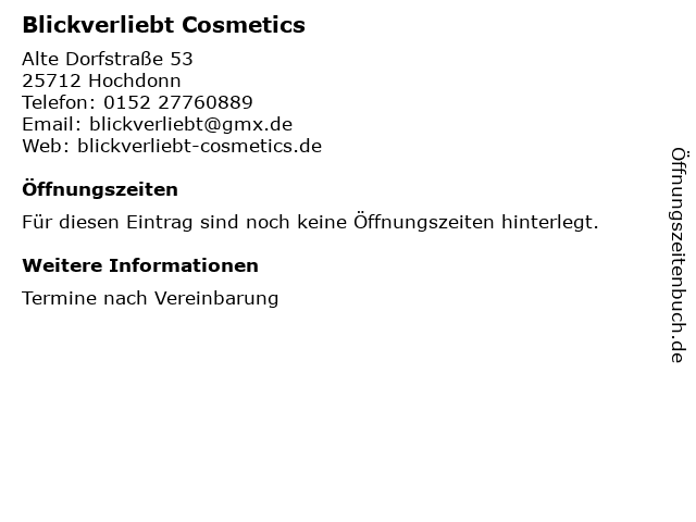 | Öffnungszeiten Blickverliebt Cosmetics in Hochdonn anzeigen | |