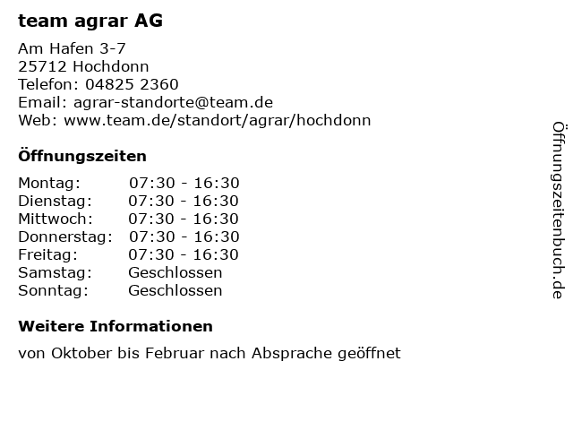 | Öffnungszeiten team agrar AG in Hochdonn anzeigen | |
