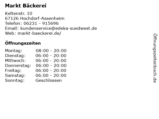 | Öffnungszeiten Markt Bäckerei in Hochdorf-Assenheim anzeigen | |