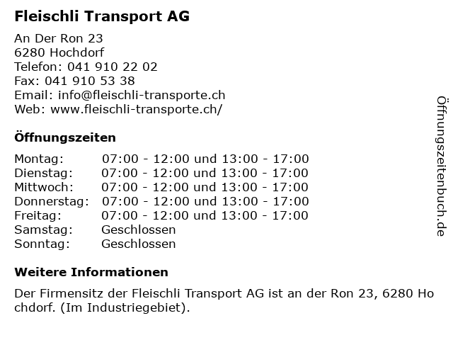| Öffnungszeiten Fleischli Transport AG in Hochdorf anzeigen | |