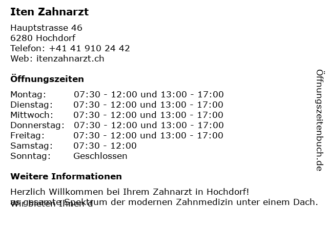 | Öffnungszeiten Iten Zahnarzt in Hochdorf anzeigen | |