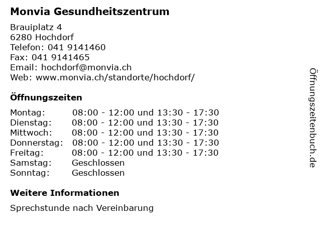 | Öffnungszeiten Monvia Gesundheitszentrum in Hochdorf anzeigen | |