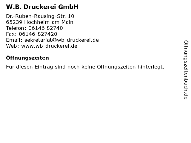 | Öffnungszeiten W.B. Druckerei GmbH in Hochheim am Main anzeigen | |