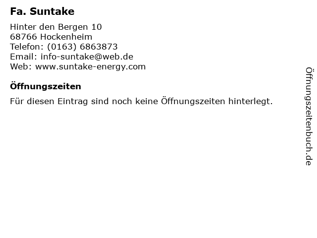 | Öffnungszeiten Fa. Suntake in Hockenheim anzeigen | |
