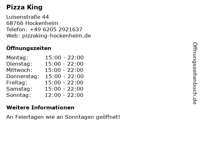 | Öffnungszeiten Pizza King in Hockenheim anzeigen | |
