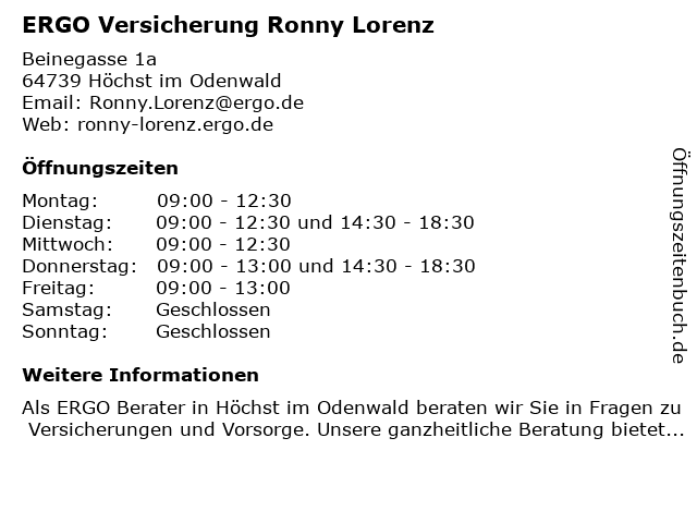 | Öffnungszeiten ERGO Versicherung Ronny Lorenz in Höchst im Odenwald anzeigen | |