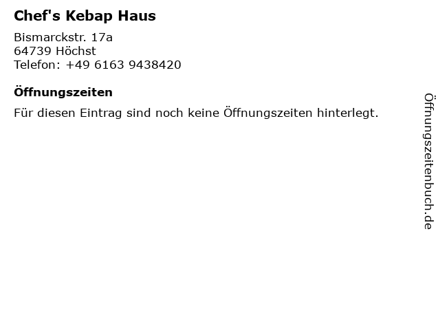 | Öffnungszeiten Chef's Kebap Haus in Höchst anzeigen | |