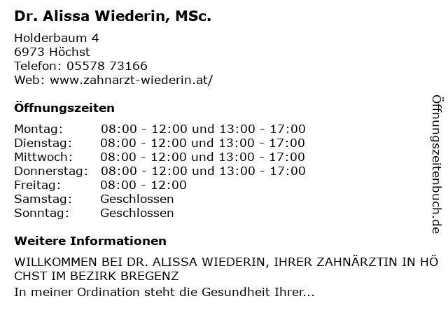 | Öffnungszeiten Dr. Alissa Wiederin, MSc. in Höchst anzeigen | |