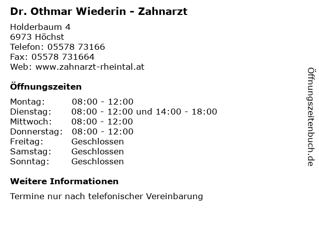 | Öffnungszeiten Dr. Othmar Wiederin - Zahnarzt in Höchst anzeigen | |