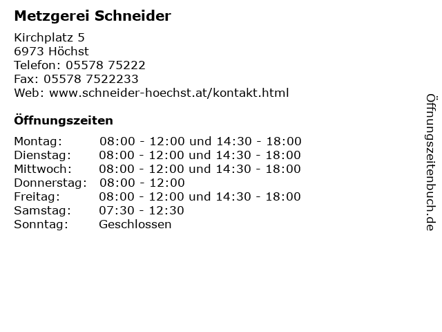| Öffnungszeiten Metzgerei Schneider in Höchst anzeigen | |