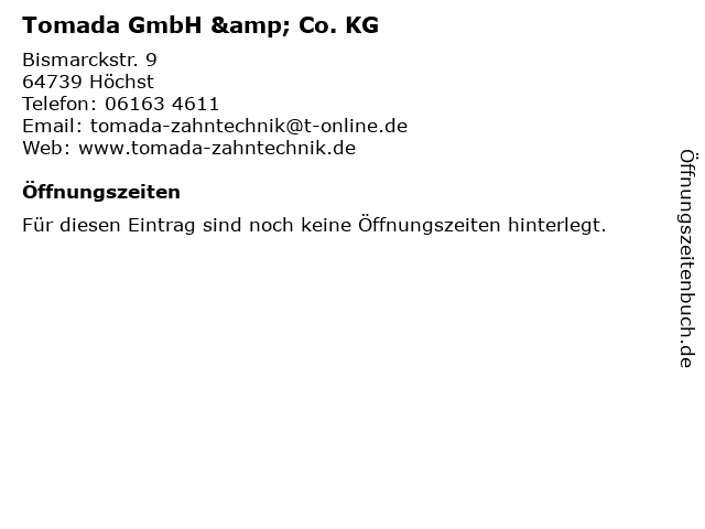 | Öffnungszeiten Tomada GmbH & Co. KG in Höchst anzeigen | |