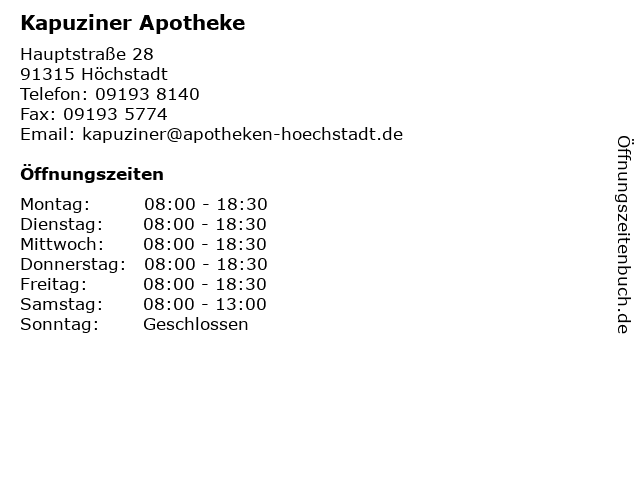 | Öffnungszeiten Kapuziner Apotheke in Höchstadt anzeigen | |