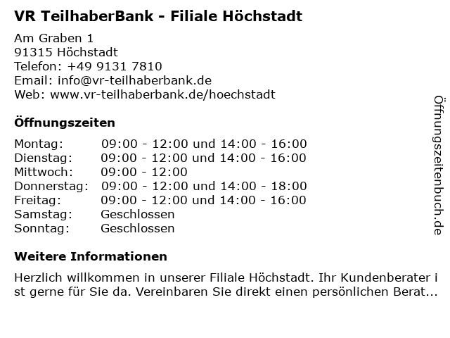 Branchen & Suchbegriffe zu VR TeilhaberBank - Filiale Höchstadt:altersvorsorge, bank, baufinanzierung, geldanlage, geldautomat, girokonto, immobilien, kredit, kreditkarte, teilhaberbank, versicherung, vr |