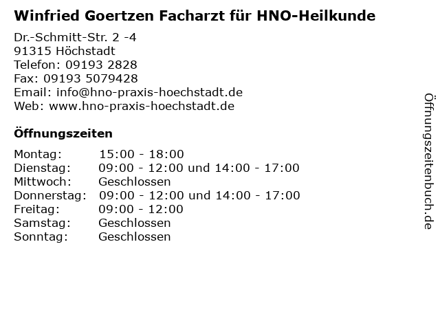 1 Gesellschaft für Galvanische Heilkunde e.V. Gesundheitsinformationsservice (Entfernung: 14,57 km) Untergreuth 14e, 96158 Frensdorf 2 Christine Ergotherapiepraxis Bayer Heilpraktiker Winfried Haus Ergotherapeutin (Entfernung: 17,87 km) Amselweg 20, 96135 Stegaurach 3 HNO am Kloster - Dr. med. Carsten Finke/ Dr. med. Hanna Hierl (Entfernung: 18,24 km) Klosterstr. 17, 91301 Forchheim 6 Praxis für Hals-Nasen-Ohren-Heilkunde, Allergologie und Umweltmedizin (Entfernung: 18,77 km) Hindenburgstraße 8, 91054 Erlangen |