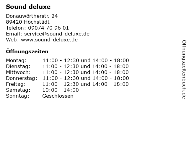 | Öffnungszeiten Sound deluxe in Höchstädt anzeigen | |