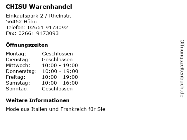 | Öffnungszeiten CHISU Warenhandel in Höhn anzeigen | |