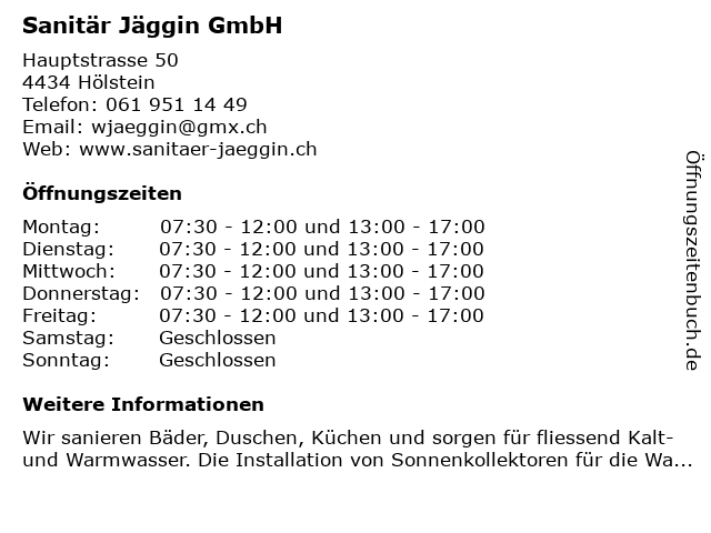 | Öffnungszeiten Sanitär Jäggin GmbH in Hölstein anzeigen | |