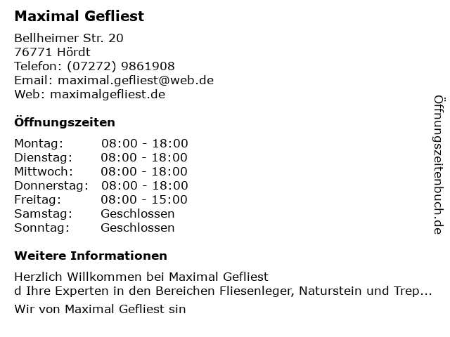 | Öffnungszeiten Maximal Gefliest in Hördt anzeigen | |