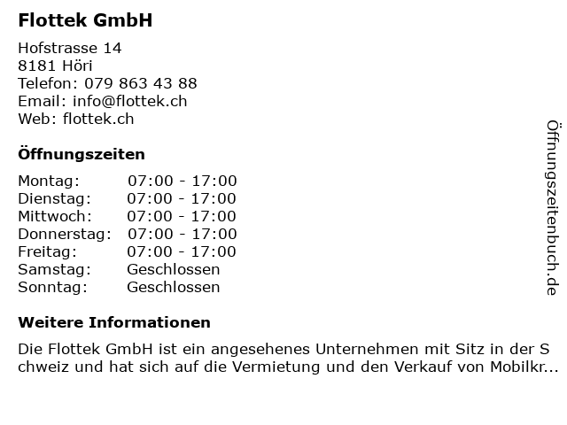 | Öffnungszeiten Flottek GmbH in Höri anzeigen | |