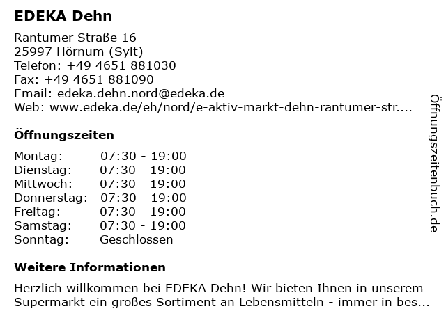 | Öffnungszeiten EDEKA Dehn in Hörnum (Sylt) anzeigen | |