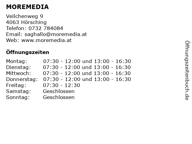 | Öffnungszeiten MOREMEDIA in Hörsching anzeigen | |