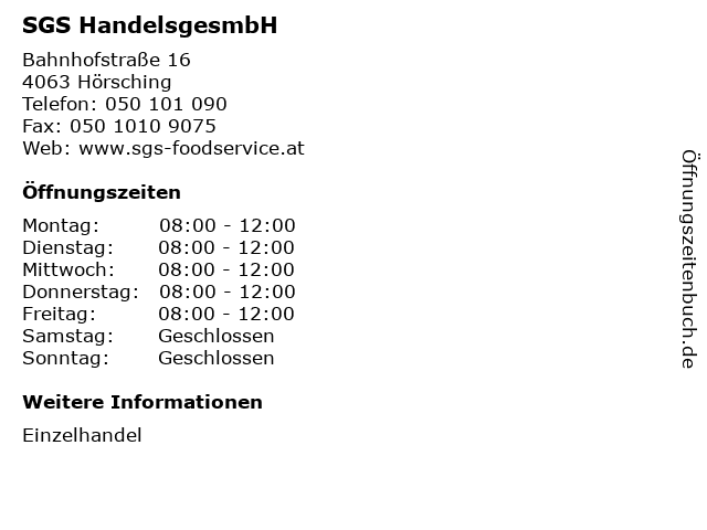 | Öffnungszeiten SGS HandelsgesmbH in Hörsching anzeigen | |