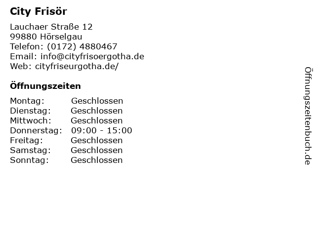 | Öffnungszeiten City Frisör in Hörselgau anzeigen | |